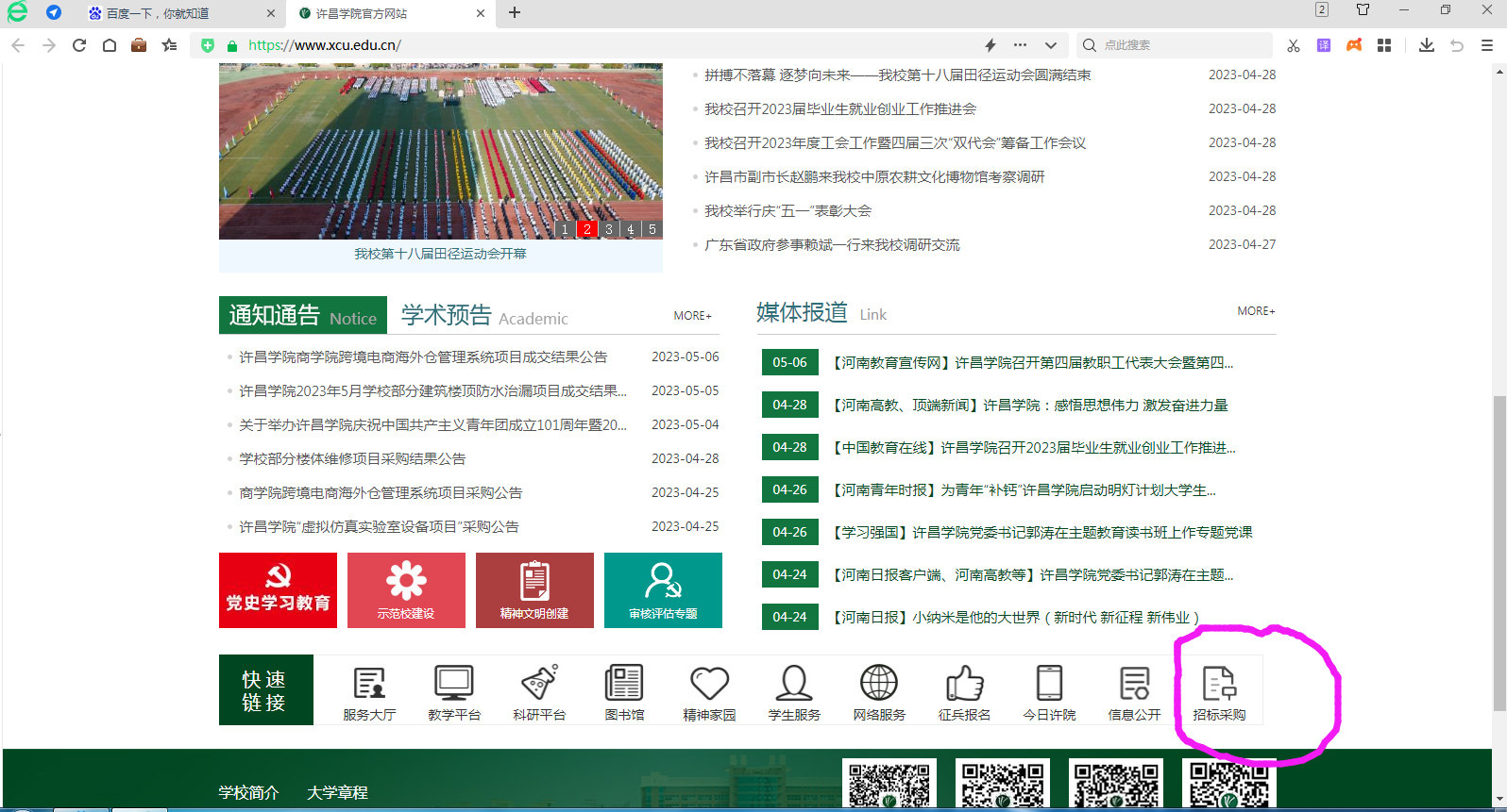 2、许昌学院官方网站最下方“快速链接”模块--“招标采购”,如下图位置:
