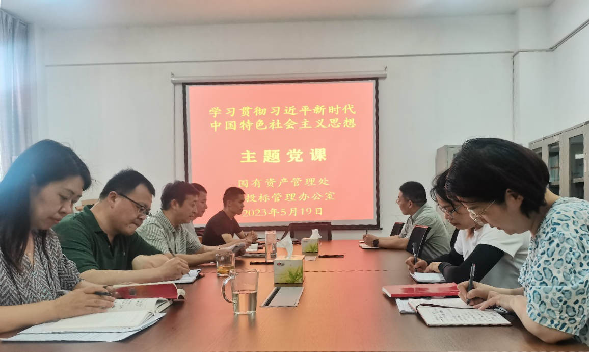 2023年5月19日下午,国有资产管理处党支部在办公楼509室召开全体党员会议,开展主题党课学习活动,深入学习贯彻习近平新时代中国特色社会主义思想。